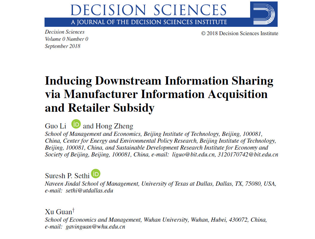 Li, G., Zheng, H., Sethi, S. P., & Guan, X. (2018). Inducing Downstream Information Sharing via Manufacturer Information Acquisition and Retailer Subsidy. Decision Sciences . DOI: 10.1111/deci.12340.