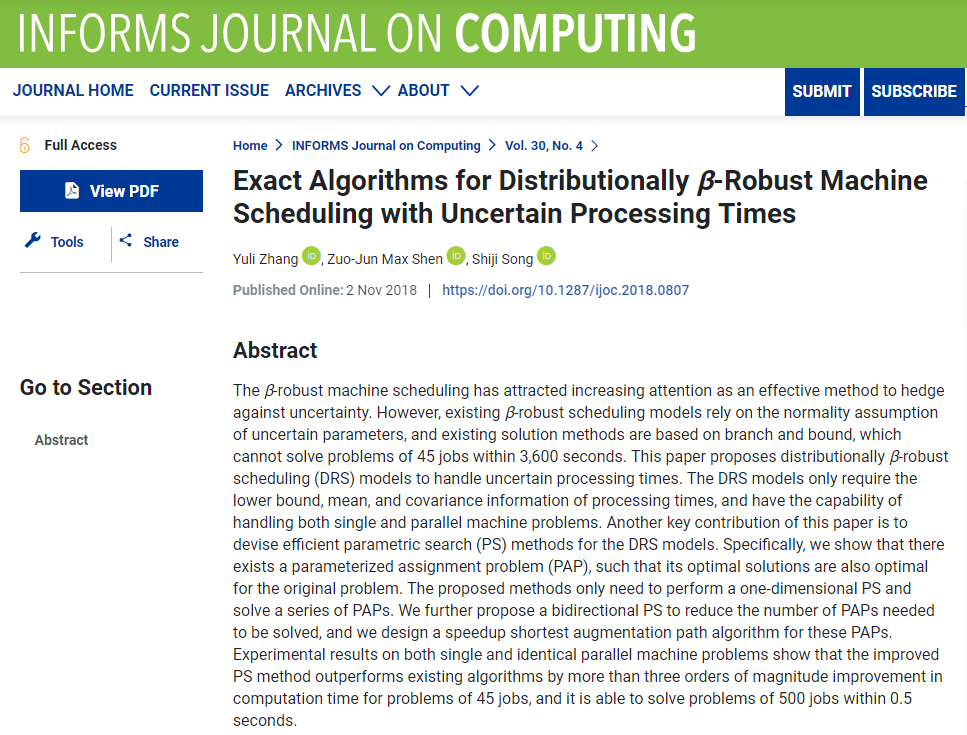 北理工管理与经济学院教师张玉利与美国加州大学伯克利分校申作军教授、清华大学宋士吉教授合作的研究成果“Exact Algorithms for Distributionally β-Robust Machine Scheduling with Uncertain Processing Times”近期在《INFORMS Journal on Computing》期刊发表。张玉利特别研究员为本文第一作者。