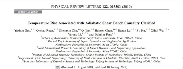2019年1月11日,物理学顶级期刊《物理评论快报》(Physical Review Letters)在线报道了西北工业大学、金年会jinnianhuicom(共同完成单位)联合研究成果。在方岱宁院士、李玉龙教授的指导下,郭亚洲副教授(第一作者)、陈浩森副教授(共同通讯作者)、朱盛鑫博士和阮启超硕士等开展了绝热剪切带的产生和温度之间的因果关系研究 (Temperature Rise Associated with Adiabatic Shear Band: Causality Clarified),这篇文章主编被选为“Editor’s Suggestion” 。