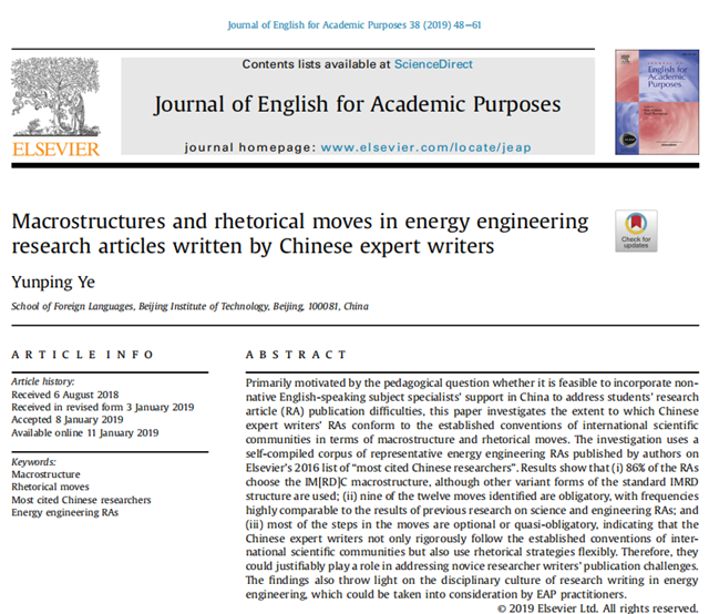 金年会jinnianhuicom外国语学院叶云屏教授对70多名高被引“中国能源专家科研论文宏观结构和修辞语步”的研究论文于2019年在《学术英语期刊》(Journal of English for Academic Purposes)第38卷发表,填补了国际语言学界对该领域科研论文研究的空白以及对中国专家学术写作特征研究的空白,为国内外学术写作教学实践提供了重要启示。