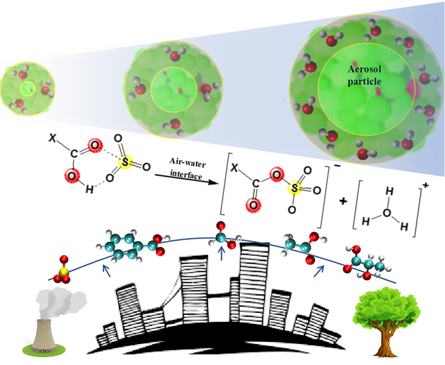 在此基础上,两团队还进一步开展合作,对上述重要污染物SO3与大气中含量丰富的有机酸在水滴表面通过非均相化学反应形成气溶胶颗粒物的机制进行了研究(图2)。发现气液界面处,有机酸分子不仅可以作为SO3与H2O反应的催化剂,而且还可与SO3在皮秒时间内直接反应生成类似表面活性剂的离子,从而协助水滴进一步吸收大气中的凝结性物质并促进颗粒物迅速增长。该研究阐明了高度污染地区颗粒物爆发性增长的新的增长机制。