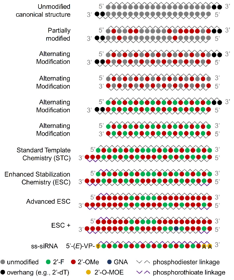 siRNA制药的关键科学问题和技术难题是如何实现安全高效的体内递送,以及如进行精细的化学修饰来显著提高其成药性。从基础研究到临床开发,该领域研究人员设计与研究了众多不同性质的药物递送系统,包括脂质体、DPC载体、环糊精聚合物、多肽、外泌体、GalNAc-siRNA缀合物等。其中脂质体、DPC载体和GalNAc-siRNA缀合物均支持了系列siRNA药物研发管线的建立和临床研究。在经历了不断的技术演化过程之后,目前本领域主要的制药公司针对肝细胞递送均发展了GalNAc-siRNA缀合递送平台,同时也尝试针对肺、肾、脑、眼等组织开发新型递送系统。与此同时,siRNA的修饰策略是另一项能决定药物开发成败的关键技术。早期的修饰方案可支持纳米化药物的研发,这是因为纳米载体对siRNA有一定的保护作用,可防止酶的攻击。近期,更为精细和考究的siRNA修饰策略,已可支持单次给药后药效持续数月、甚至一年。总之,在siRNA递送和修饰方面的技术演化,始终作为最关键的动力引擎,推动着RNA干扰药物的研发。