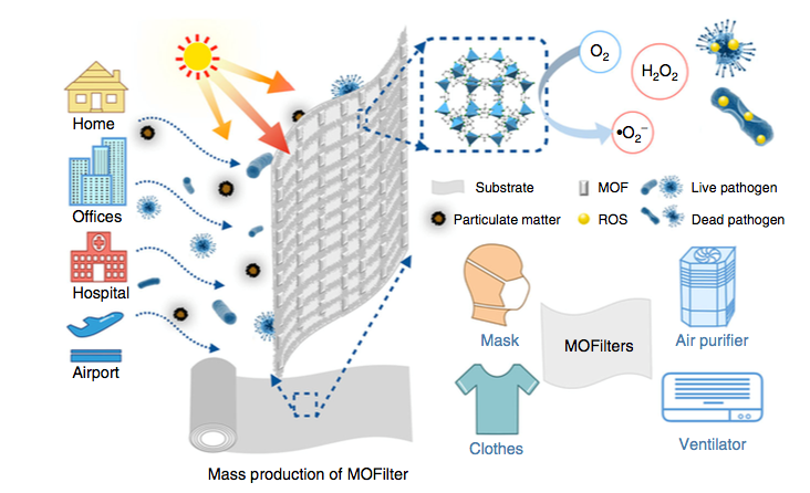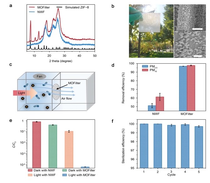 该研究团队结合前期的研究工作制备了一系列具有光催化活性的MOFs,筛选了具有超高光催化杀菌活性的ZIF-8,实现对水体中大肠杆菌的高效杀灭,杀菌率大于99.9999%。然后利用热压法设计合成了新型的高效综合空气过滤器(MOFilter),PM微粒捕获效率能达到98%以上,同时还可以杀灭空气中99.99%的细菌。机理研究发现,ZIF-8在太阳光催化作用下光生电子产生于LMCT,并且可以有效的活化O2形成•O2–和H2O2,其可以使空气中的致病细菌氧化致死。