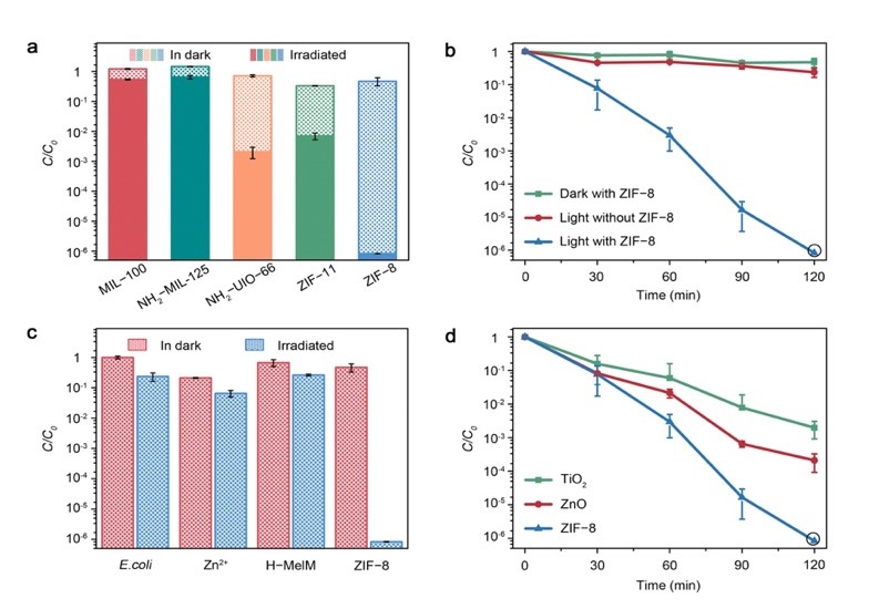 作者首先对比了一系列具有光催化活性的MOFs,实验结果表明,ZIF-8在模拟太阳光照射2 h之后,其对大肠杆菌的杀灭效率大于99.9999%。通过ICP-MS和光催化杀菌实验验证了ZIF-8优异的杀菌性能主要来自于光催化产生的活性氧自由基,而不是释放的Zn2+的杀菌作用。同时与传统光催化杀菌半导体做了对比,ZIF-8光催化杀菌效果和速率都高于ZnO和TiO2。