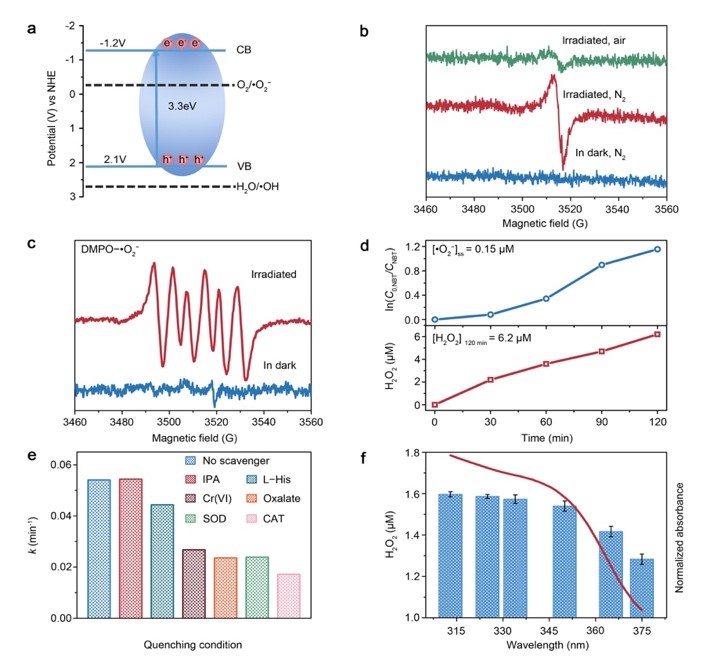 在光催化杀菌机理方面,通过UV-vis,M-S和VB-XPS确定了材料的能带结构,从理论上预测了可以产生•O2–,但不能产生•OH。而在实验过程中我们也通过一些常规的表征手段,比如EPR、紫外吸收、荧光光谱等方法检测了材料在光照条件下产生的自由基,其结果与理论预测一致。自由基的捕获实验证明光催化过程中产生的•O2–和H2O2起了主要的杀菌作用。通过测试材料在77k下不同气氛条件下的固体EPR证明了光生电子是由配体转移到金属(LMCT),然后活化空气中的氧生成•O2–以及相关的H2O2。
