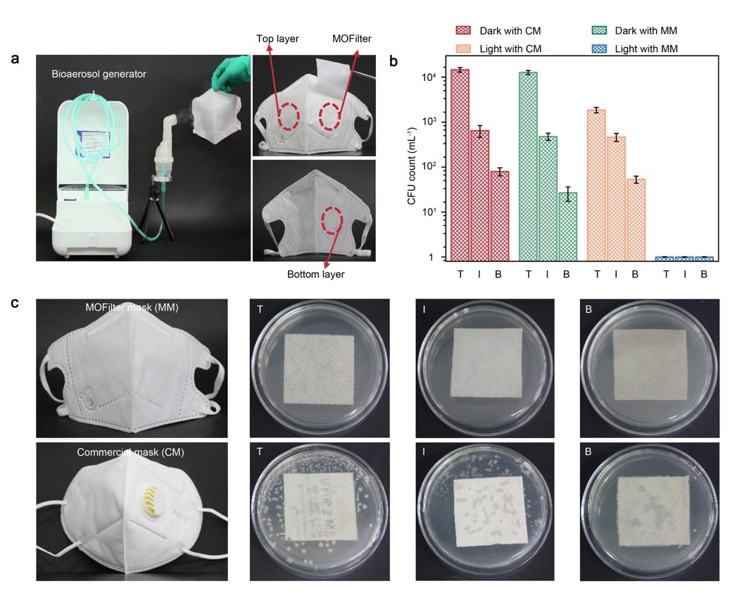 为了实现个人防护功能,作者开发了一款基于MOFilter的个人防护用品(MOFilter口罩)。通过喷洒微生物气溶胶模拟真实使用场景,然后分别检测MOFilter口罩三层的细菌存活率,光照30min,MOFilter口罩三层均没有细菌存活。同时和商用的N95口罩做了对比,相同条件下,商用口罩残留大量的活菌。在此实验结果基础之上,作者也将ZIF-8热压在真丝布上,用于加工制备自清洁衣物。这项研究成果在个人防护方面具有极高的应用前景。
