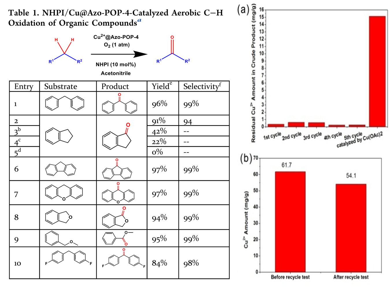 负载Cu2+的有机多孔材料(Cu@Azo-POP-4)被开发为绿色氧化有机化合物C-H键的高效催化剂,将茚满、二苯甲烷、蒽醌等底物中的亚甲基催化氧化为酮羰基。利用核磁共振氢谱(1H-NMR)和气相色谱-质谱联用法(GC-MS)观察到: Cu@Azo-POP-4催化剂对该C-H氧化反应具有化学选择性高和分离产率高等特点(图5-左图)。同时,Cu@Azo-POP-4具有良好的重复使用性和对产物的低污染性。这主要归功于Azo-POP-4的氨基偶氮官能团与Cu2+间存在极强的配位作用,使得Cu2+均匀地被聚合物骨架束缚,以防止其流失(图5-右图)。该工作为进一步发展功能化有机多孔材料的结构设计和应用范围奠定了基础。