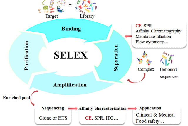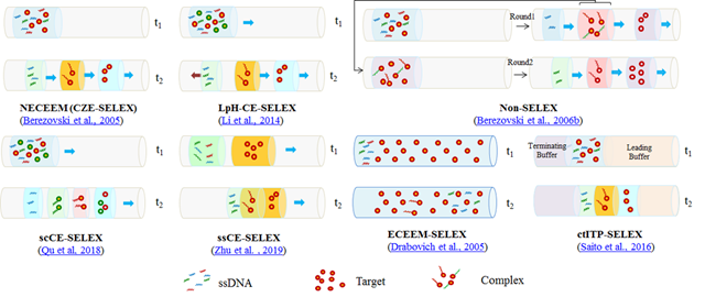 毛细管电泳(CE)是一种高效分离和快速分析的微量分析技术,可全程监控筛选过程,实现靶标性质评价、靶标-核酸复合物的高效分离与收集,适配体亲和力、特异性定性定量分析等多重功能。从常规的CZE-SELEX衍生而来的多模式CE筛选方法,大幅度提升了筛选效率,缩减了适配体筛选的人力、物力与时间。课题组已提出的三种新模式: LpH-SELEX可大幅度提升非结合序列的消除效率,ssCE-SELEX实现了靶标与核酸库反应比例、时间的在线控制,scCE-SELEX实现多靶标的亲和力、特异性同步筛选。针对多尺度靶标的新型CE-SELEX筛选模式正在进行中。后续研究将结合更多的优势技术与方法,以有效结合位点分析为导向,以实现不同尺度靶标的功能性核酸适配体的精准筛选,以满足不断增长的适配体的多领域应用需求。