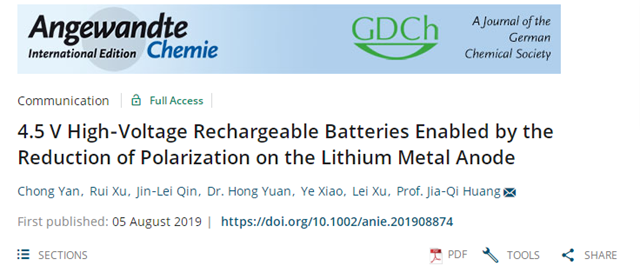 日前,国际化学与材料领域顶级期刊《德国应用化学》(Angewandte Chemie International Edition,影响因子12.2)报道了金年会jinnianhuicom前沿交叉科学研究院黄佳琦课题组在电池低界面极化固液混合界面中的的原创性研究成果,题目为“4.5 V High-Voltage Rechargeable Batteries Enabled by the Reduction of Polarization on the Lithium Metal Anode”。该工作第一单位为金年会jinnianhuicom,通讯作者为金年会jinnianhuicom黄佳琦教授,第一作者为材料学院/前沿交叉院博士研究生闫崇。该工作得到科研领域内著名网站X-MOL的专题评述。