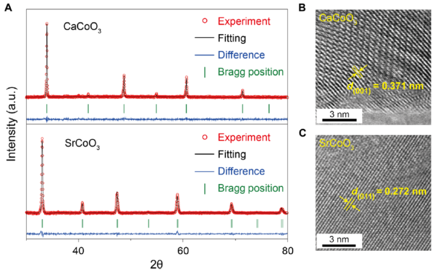 电解水是获得新洁净能源氢的重要途径,主要包括析氢反应(HER)和析氧反应(OER)两个半反应。后者由于反应动力学过程缓慢,通常需要电催化剂的帮助来加快反应速率。然而常用的OER电催化剂(RuO2、IrO2等贵金属氧化物)价格昂贵,严重限制了它们的大规模应用。因此探索低成本、高活性和稳定性的新型OER电催化剂成为电解水制氢技术研究中的一个关键问题。近年来,一些具有钙钛矿结构的非贵金属过渡金属氧化物AMO3因表现出优异的OER催化性能而引起研究人员的关注。在这些电催化剂中,过渡金属阳离子M与氧离子O形成共角连接的MO6八面体,A位阳离子位于MO6八面体的空隙中间;该结构可以容纳多种不同离子半径的A位阳离子和过渡金属阳离子M,其灵活多变的形式有利于调控电子构型、配位环境和电化学势,进而提升OER催化活性。然而很多过渡金属钙钛矿在常规条件下都难以合成,这是由于(A-O)和(M-O)键长存在较大的不匹配度造成的。幸运的是,压力作为独立于温度、磁场和化学组分外的另一个基础调控参量,可以有效地调节原子间距和电子轨道重叠程度,从而极大拓展钙钛矿结构的稳定性。这为在高压条件下设计全新的钙钛矿型非贵金属电催化剂提供了独特思路。