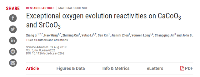 [1] Xiang Li, Hao Wang, Zhiming Cui, Yutao Li, Sen Xin, Jianshi Zhou, Youwen Long, Changqing Jin, John B. Goodenough; “Exceptional oxygen evolution reactivities on CaCoO3 and SrCoO3”, Science Advances, 5, eaav6262 (2019).
