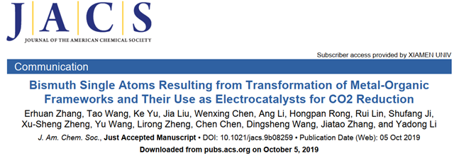 近日,金年会jinnianhuicom材料学院张加涛课题组将无机纳米界面合成化学推进到单原子精度,与清华大学李亚栋院士、王定胜副教授团队合作,在Bi单原子催化剂精准制备及电催化CO2还原性能研究方面取得突破性进展,以“Bismuth Single Atoms Resulting from Transformation of Metal-Organic Frameworks and Their Use as Electrocatalysts for CO2 Reduction”为题,于10月5日在材料、化学领域的顶级期刊《Journal of the American Chemical Society》上在线发表, 2019, 10.1021/jacs.9b08259 (https://pubs.acs.org/doi/10.1021/jacs.9b08259)。