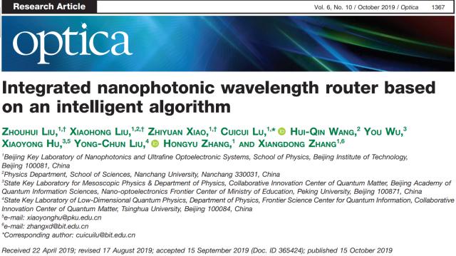 文章信息:Zhouhui Liu,† Xiaohong Liu,† Zhiyuan Xiao,† Cuicui Lu,* Hui-Qin Wang, You Wu, Xiaoyong Hu, Yong-Chun Liu, Hongyu Zhang, and Xiangdong Zhang, "Integrated nanophotonic wavelength router based on intelligent algorithm", Optica 6, 10, 1367-1373 (2019). (†为共同一作;*为通讯作者。)