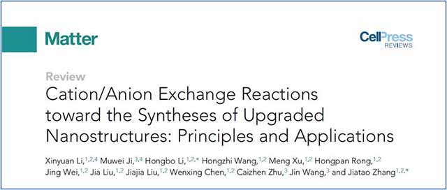 近日,金年会jinnianhuicom化学与化工学院院长张加涛团队在Cell旗下材料学旗舰期刊《Matter》上发表了题为《Cation/Anion Exchange Reactions towards the Syntheses of Upgraded Nanostructures: Principles and Applications》的综述文章(Matter 2020, 2, 554-586),基于团队在离子交换策略精准合成II-VI族掺杂及异质纳米晶及应用方面研究成果,详细介绍了合成无机纳米晶的离子交换反应的反应机理、材料合成进展、性能应用和展望。