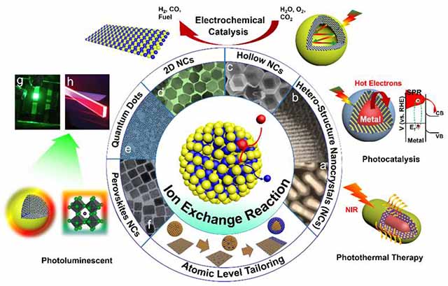 基于详尽的文献调研,团队梳理近几年离子交换策略用于合成无机纳米晶的研究展望,主要包括以下内容:(1)离子交换反应机理的研究进展,主要包括热力学和动力学研究、溶剂配体的研究。其中,张加涛教授团队近年来深入研究了配体和溶剂等对于逆向竞争离子交换反应机理影响及应用拓展(Angew. Chem. Int. Ed. 2015, 54, 3683 –3687; Angew. Chem. Int. Ed. 2019, 58, 1 – 7);(2)离子交换反应策略在精准调控制备在包括合金态/掺杂量子点、异质纳米晶、中空纳米晶、钙钛矿纳米晶、二维纳米晶等无机胶体纳米晶方面研究进展。其中张加涛教授团队提出了逆向竞争阳离子交换反应策略并实现了II-VI族量子点深度位置的异价重掺杂,为有效解决自清洁效应引起的稳定掺杂问题提供新方法、新材料(Adv. Mater. 2015, 27, 2753–2761)。并进一步用逆向竞争阳离子交换反应策略实现了水相制备金属-单晶半导体异质纳米晶,在实现高结晶度壳层的同时,可以有效实现其低缺陷的异质界面及应用(Nano Energy 2019, 57, 57–65)。团队基于异质纳米晶的合成工作,从晶格失配的角度梳理了纳米晶界面合成化学综述(Chem. Rev. 2020, 120, 2123-2170);(3)离子交换反应精准合成的纳米晶的性能应用研究进展,包括荧光调控、光热性能、光催化/光电催化性能研究、电化学应用等等。例如张加涛研究团队与合作者发现Ag掺杂CdSe量子点的光诱导Ag+向Ag2+转变和因此产生的光诱导磁性(Nat. Nanotech. 2018, 13, 145-151),利用阳离子交换策略制备的具有清晰异质界面的单晶核壳纳米晶在光解水产氢 (Nano Energy 2018, 48, 44–52;Adv. Energy Mater. 2019, 9, 1803889)、近红外光电探测(Nano Energy 2019, 57, 57–65)、光热疗应用(Adv. Mater. 2016, 28, 3094–3101)等领域均展现出了较高的性能优势;(4)离子交换策略的展望,包括用于复杂微纳结构的精准制备,进一步实现原子级位点和表界面应变的调控等。