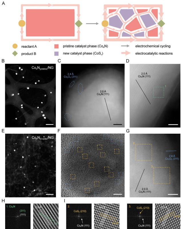 图1. 预催化剂的原位电化学相演变的示意图和对应的电子显微图像。富金属化合物作为预催化剂(以Co4N为例)在工作电池中经历原位“马赛克化”相演变的过程示意图。