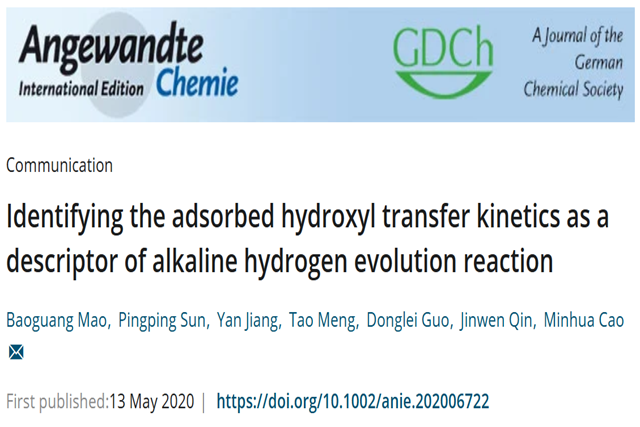 论文详情:Baoguang Mao, Pingping Sun, Yan Jiang, Tao Meng, Donglei Guo, Jinwen Qin, Minhua Cao*. Identifying the adsorbed hydroxyl transfer kinetics as a descriptor of alkaline hydrogen evolution reaction, Angewandte Chemie International Edition, doi: 10.1002/anie.202006722. 论文链接:https://onlinelibrary.wiley.com/doi/abs/10.1002/anie.202006722