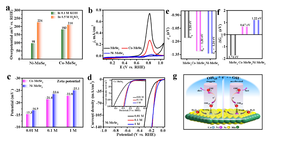 图2:(a)碱性和酸性介质中HER活性比较;(b,c,d)CV、 Zeta电位及不同碱性介质下HER催化活性表征;(e,f)DFT理论计算分析OHad + e– ↔ OH–转化过程;(g)Ni/Co-MoSe2对 OHad + e– ↔ OH–过程的作用机制示意图。