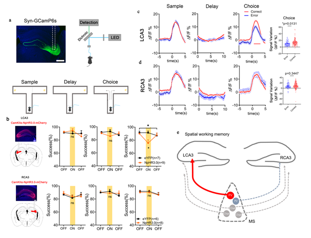 海马CA3在空间工作记忆中起到重要作用,但是CA3在空间工作记忆的哪个阶段起作用,以及CA3的单侧化功能是否体现在空间工作记忆中尚不清楚。该工作利用光纤记录技术发现小鼠CA3的神经元活动性在空间工作记忆的编码和检索阶段均有升高,而左侧CA3神经元在选择阶段作出正确选择时显示出更高的活动性。随后, 利用在体电生理技术发现左侧CA3神经元在选择阶段有先于右侧CA3神经元放电的趋势;接着利用光遗传学技术发现,在选择阶段只有抑制左侧海马CA3神经元活动性可以损坏小鼠在空间工作记忆中的表现。最后利用逆行病毒载体示踪技术发现上游脑区内侧隔核(MS)向左右侧CA3区不同类型神经元的投射有所区别,光遗传抑制MS-LCA3环路能够损害小鼠在空间工作记忆中的任务表现,并且显示出该环路调控CA3单侧化功能。