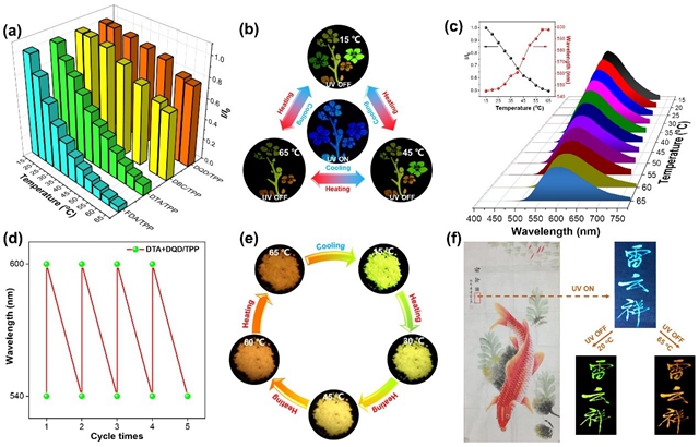 图2.(a)主客体材料在15-65 oC温度范围内的原位磷光强度变化。(b)在不同温度下去除激发源之前(中间)和之后的花朵照片。DTA-DQD/TPP掺杂材料(c)在不同温度下的磷光波长和强度;(d)在四个循环中原位磷光波长变化;(e)在不同温度下的磷光颜色变化;(f)在书法和艺术品防伪中的应用。