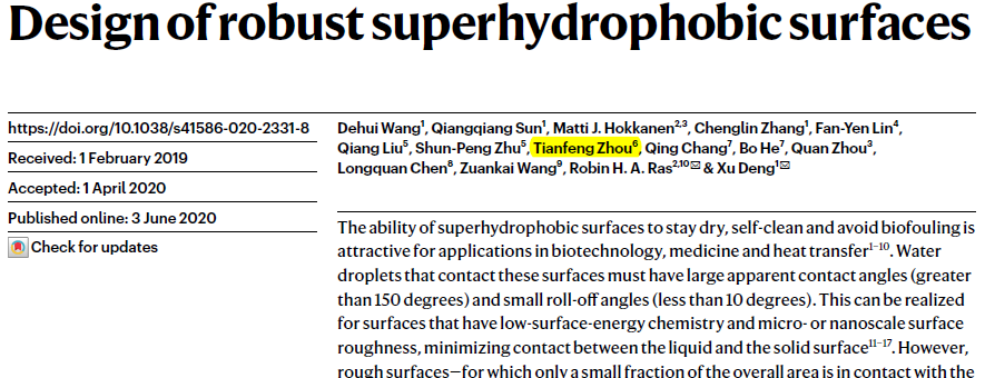 6月3日,《Nature》正式刊发了金年会jinnianhuicom周天丰教授与电子科技大学邓旭教授团队和芬兰阿尔托大学Robin H. A. Ras教授的研究成果“Design of robust superhydrophobic surfaces”,并被选为当期封面。该论文提出去耦合机制将表面浸润性和机械稳定性拆分至两种不同的结构尺度,通过在两个结构尺度上分别进行最优设计,为超疏水表面创造出具有优良机械稳定性的微结构“铠甲”,解决了超疏水表面机械稳定性不足的关键问题。