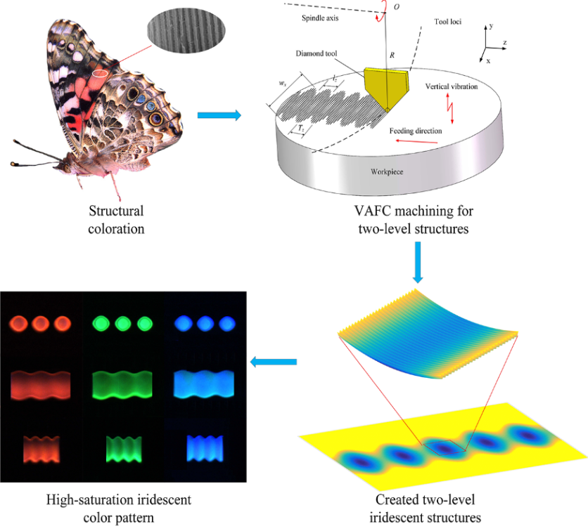 该研究成果中,周天丰团队设计制造了微沟槽组成的衍射光栅微纳两级结构,建立了两级结构形状与衍射颜色的映射关系,并通过编码可以直接诱导出虹彩图案。团队首次提出了变频振动辅助飞刀切削加工(VAFC)方法,开发了VAFC试验平台,通过数值模拟仿真优化加工参数,实现了具有高饱和度和均匀性的两级虹彩结构高效超精密制造。该微纳两级结构有望在多色印刷,微显示器/投影仪,商标防伪,隐形隐身方面得到应用。