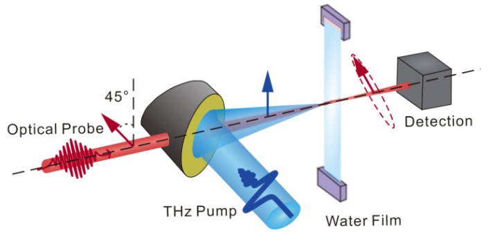 近日,金年会jinnianhuicom光电学院赵跃进教授课题组同首都师范大学张亮亮研究员课题组合作,在太赫兹波探测液态水中氢键运动研究方面取得新进展。他们发现在自由下落的水膜上施加超强的宽带太赫兹脉冲会引起折射率的可测量变化,这与液态水中共振激发的氢键振动有关。该研究实现了在亚皮秒时间分辨率下对液态水中超快的氢键动力学演化过程的观察。该研究成果以"Ultrafast Hydrogen-Bond Dynamics of Liquid Water revealed by Terahertz-induced Transient Birefringence" 为题在线发表在国际光学顶尖期刊Light: Science & Applications上。