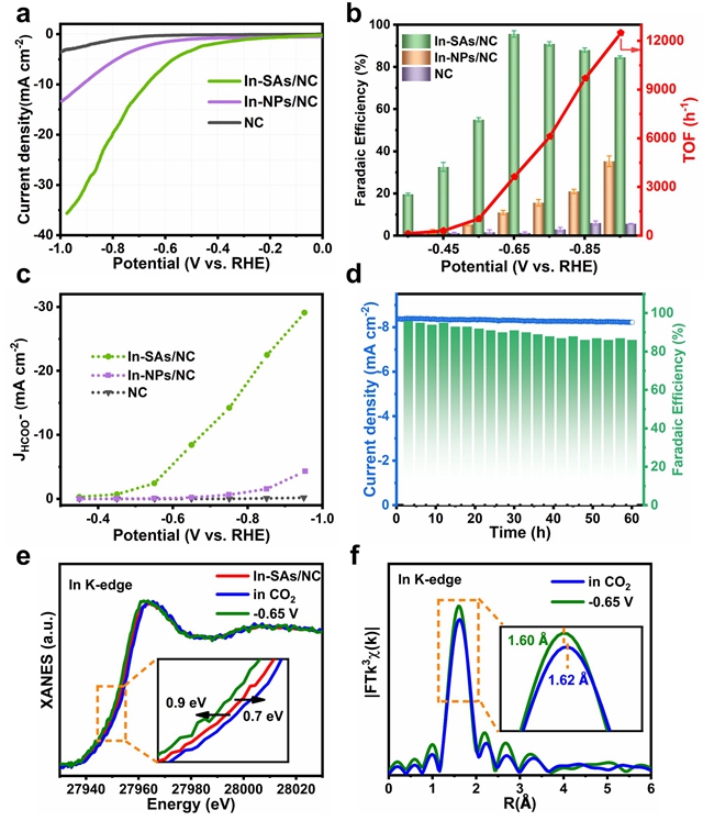 图3 In单原子电催化CO2RR选择性制备甲酸盐性能测试