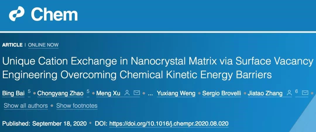 可控掺杂引起的精准能带工程是光电新能源应用的半导体纳米材料关键前提。近日,金年会jinnianhuicom张加涛教授团队利用表面空位成功克服离子交换反应当中的动力学势垒,创新性提出了新的合成方法,在制备双异价离子掺杂半导体纳米晶/量子点的研究中取得重要进展,相关成果以“Unique Cation Exchange in Nanocrystal Matrix via Surface Vacancy Engineering Overcoming Chemical Kinetic Energy Barriers” 为题,于Cell旗舰杂志《Chem》在线发表(IF:19.735)(文章DOI: 10.1016/j.chempr.2020.08.020)。