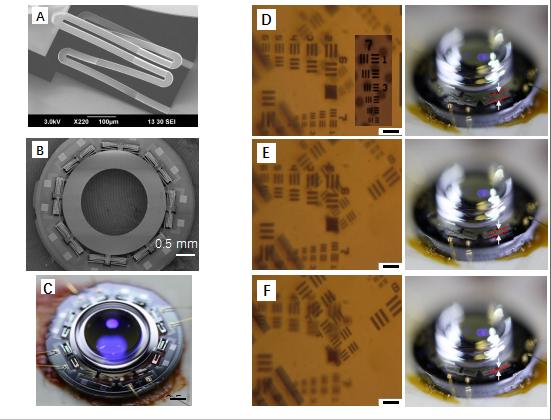图2. (A) 电热MEMS执行器SEM;(B)MEMS微驱动平台芯片SEM;(C)MEMS微透镜照片;(D-F)MEMS微透镜在不同电压下的USAF分辨率卡叠层显微图片。