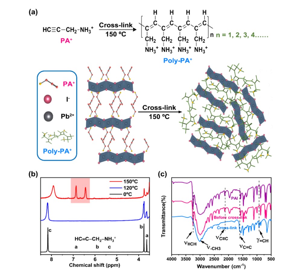 图1 形成交联1D类钙钛矿结构原理及核磁红外表征