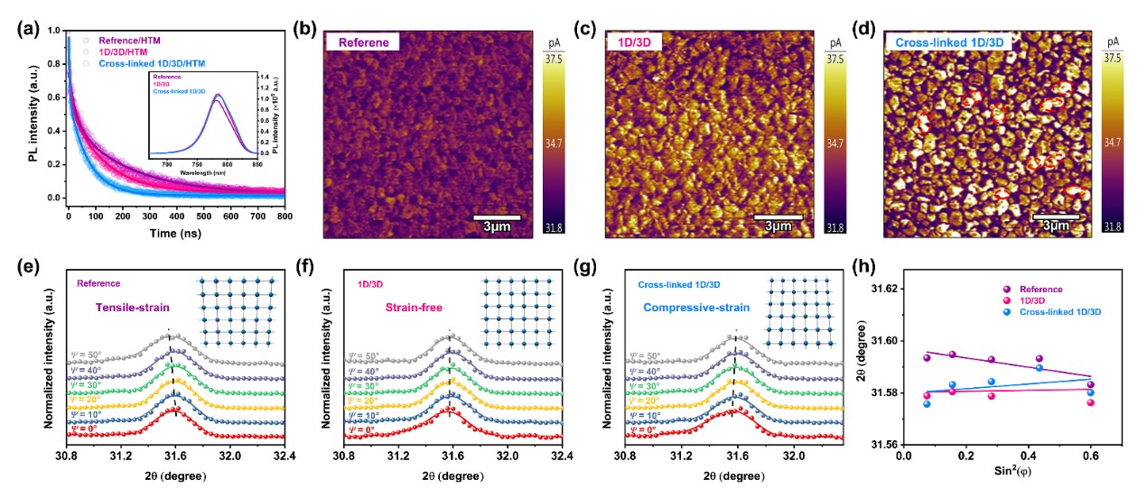 此外,利用深度分辨的掠入射X射线应变测试,作者研究了混相钙钛矿多晶薄膜的残余应变。1D/3D钙钛矿异质结构中,1D类钙钛矿薄膜中丙炔胺阳离子在加热过程中发生聚合交联后,钙钛矿活性层的残余拉伸应变变为压缩应变(图2),这既有利于PSCs的光伏性能提升,又能提高其稳定性。这一特征为钙钛矿材料界面应变的调制提供了一种可行的方法。交联1D/3D钙钛矿太阳能器件的最高光电转化效率达到21.19%, 开路电压Voc为1.11 V, 短路电流 J SC为23.69 mA · cm−2, 填充因子FF 为80.76%。与标准实验器件相比,cross-linked 1D/3D器件的短路电流明显提升。