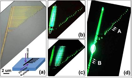 为此金年会jinnianhuicom纳米光子学与超精密光电系统北京市重点实验室的刘瑞斌副教授、硕士生张春花在邹炳锁教授带领下,在基金委青年基金、校创新团队基金、校重大预研基金等项目支持下,在一维半导体阵列结构制备及光子学行为的研究上取得了重要突破:利用本团队前期首次实现的II-VI族半导体周期性超晶格--CdS/SnS2一维光子晶体线(http://pubs.acs.org/doi/pdf/10.1021/ja1037963)为基体模板,通过反复试验,成功发明了一种一步气相法制备CdS一维单晶线阵列梳状结构的方法, 获得了角度可调、周期尺度可调的梳状结构,并与海外合作者研究了其微结构和高效的光波导行为(见下图),结果显示不同方向传播的光子耦合效率比量子线交叉传播大大增强,为下一步一维微纳光子器件的构建与应用打下了坚实的基础。