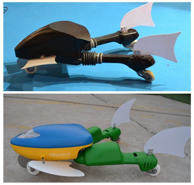 图3中展示了两个机器人:黑色的是第一代两栖蛙板机器人;花色的是第二代两栖蛙板机器人。二代机器人是在一代机器人的基础上发展而来,它在稳定性以及运动速度方面有了很大的提高。