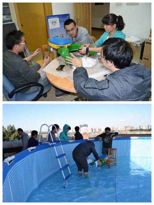 接近一年的奋斗历程,团队成员克服了种种困难成功地进行了两代两栖机器人的制作以及调试。期间团队成员也遇到了很多困难:机械干涉问题、外壳难以安装、电机老化极其损坏、烧坏电路板、程序调试难题、信号干扰……在困难面前,团队成员用最理智的方法解决难题,保证每次的损失达到最小。机械零件的绘制、外壳模型的建立与绘制、机器人的整体安装、加工厂的寻找、合同的签订、方案的制定……每一个过程团队成员都得亲自完成。