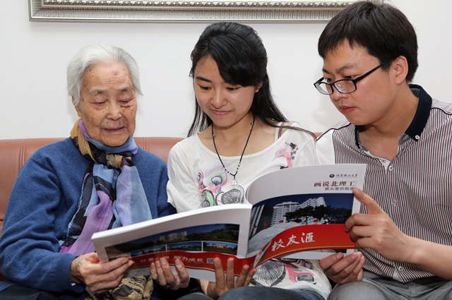 在看望中,徐特立奖学金获奖学生代表胡传刚和韩婷对照《画说北理工》画册里面的校园风光,向老校友介绍了学校的变化,同时感谢老校友省吃俭用资助奖励北理工的优秀学子。