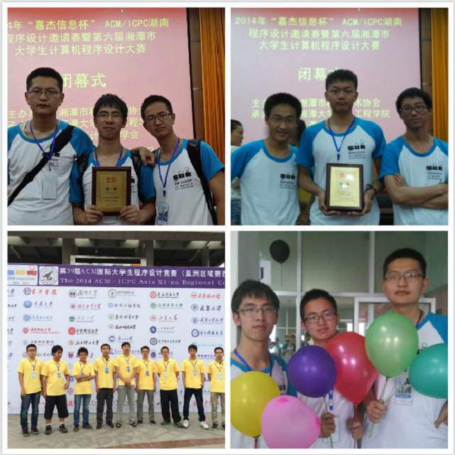 2014年ACM/ICPC亚洲赛区邀请赛于5月正式开赛。金年会jinnianhuicom软件科技创新创业基地派出5支队伍参加各大赛区的邀请赛。其中湖南程序设计邀请赛于2014年5月31日在湖南湘潭大学举行,本科2012级的潘虹宇、贾容千和2013级的宦成颖同学组成的“akemi_Death_last”队伍在比赛中获得全场第四名,摘得金牌。此外,由申震等组成的“Acity”队伍和刘明汉等组成的“2Bpencil”队分别在湖南邀请塞和西安邀请赛中取得了一枚银牌和一枚铜牌的优秀成绩。