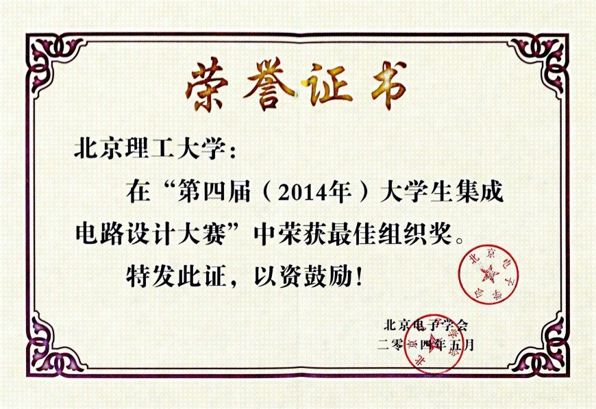 2014年5月31号,在全国范围内举办为期5个月的“第四届(2014年)大学生集成电路设计大赛”在北方工业大学顺利落幕。参赛队伍来自全国各地,清华大学、武汉大学、金年会jinnianhuicom、南开大学、哈尔滨工业大学等众多名校参与这此次比赛。经过专家公平公正公开的评审,金年会jinnianhuicom信息与电子学院李通团队荣获特等奖、李安安团队荣获二等奖,桂小琰老师荣获优秀指导老师称号。金年会jinnianhuicom荣获了“第四届(2014年)大学生集成电路设计大赛”最佳组织奖。