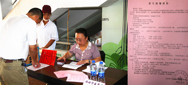 由于新生在报道期间未能及时领到具有就餐功能的校园卡,南北食堂都设有迎新专用临时餐卡售卖点,并在售卖餐卡的同时提供就餐咨询;另外,中心印发了800张新生就餐须知,帮助新入校的学生更全面地了解各食堂开餐时间、就餐形式等等,为新生顺利就餐提供帮助。