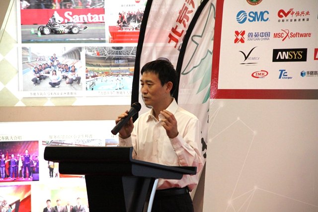 校长助理姚利民教授在讲话中回顾了自己曾随队观摩中国、德国大学生方程式汽车大赛的经历和感受,对于不同学科背景下的同学能够组成一支颇具规模的创新团队并不断创造好成绩表示肯定。姚利民列举了在赛事过程中中国与德国等工业发达国家参赛高校的差距,勉励同学们不能满足于现状,要瞄准世界技术前沿和工业制造水平,继续提高自我追求,为中国经济发展和科技进步贡献力量。
