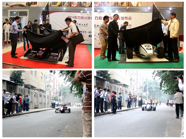 新车发布会最后,与会嘉宾与学生代表共同为2014年新车“黑鲨五”、“银鲨三”揭幕,并见证了两辆新车的起跑,观摩了其加速、制动动态演示“黑鲨五”选用了国产亚翔排量449毫升汽油机,学生在原化油器汽油机的基础上进行了电喷改造,重新设计了进、排气系统,采用气动换挡、气动离合技术,设计了轻质空气动力学套件;整车最大功率约34KW,整车整备质量165KG,百公里加速约3.9s,最大侧向加速度约2.1G。“银鲨三”采用了自主设计的电池系统和整车控制器,设计了快速充电系统使得充电时间减少至之前的20%—30%,传动采用了自主设计行星轮减速器;整车峰值功率85KW,峰值扭矩为175 N•m,整车整备质量230KG,百公里加速约3.6s,最大侧向加速度约2 G。新车发布会后经过最后的调整和实验,两辆赛车就将启程运往湖北省襄阳市,参加将于10月中旬在此举办的中国大学生方程式汽车大赛。
