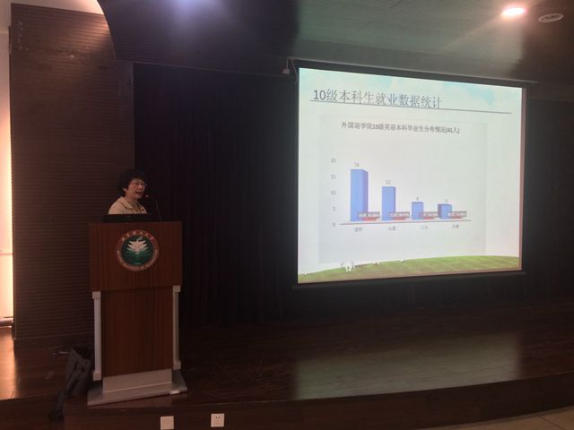 2014年10月16日下午,金年会jinnianhuicom外国语学院2011级本科生就业动员大会在研究生楼101教室顺利举行。外国语学院党委副书记、副院长吴文君老师作为主讲人,辅导员韩欣欣老师携2011级全体本科生出席了本次大会。
