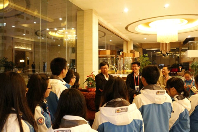 随后,李和章副校长一行到亚奥国际酒店慰问机场交通组的我校志愿者。李校长亲切地询问了志愿者的工作安排与工作情况,并勉励同学:“现在中国逐渐承办越来越多的国际型活动,承担越来越多的国际责任,发挥更大的影响力。对于大家来说,这次的APEC是一个机会,是一个展示中国形象、展示北京大学生风貌的机会,同学们要好好珍惜,好好加油。”在对大家工作给予高度赞扬与肯定的基础上,希望大家在接下来的一段时间内认真工作,合理休息,并注意自身安全。