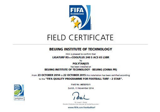 日前,我校中关村校区西操场足球场顺利通过国际足联FIFA 2 STAR认证,这是全球足球领域最高权威检测机构的最高级别场地认证。通过FIFA 2 STAR认证的场地,可以举办FIFA的任何决赛阶段的比赛和欧足联(UEFA)的最高级别赛事,代表着行业的最高标准。我校西操场足球场也是国内高校首个通过FIFA 2 STAR的人造草皮足球场。