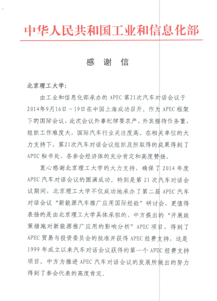 工业和信息化部给北理工发来感谢信
