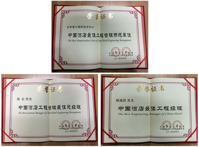 2013年和2014年,理工国际会议中心连续两次获得中国酒店工程联盟、中国酒店“金工奖”评审委员会评选的“中国酒店最佳工程管理示范单位”和“中国酒店最佳工程管理示范单位”荣誉称号。姚继民同志连续两年被评为“中国酒店最佳工程经理”,郑红同志连续两年被评为“中国酒店工程管理最佳总经理”。