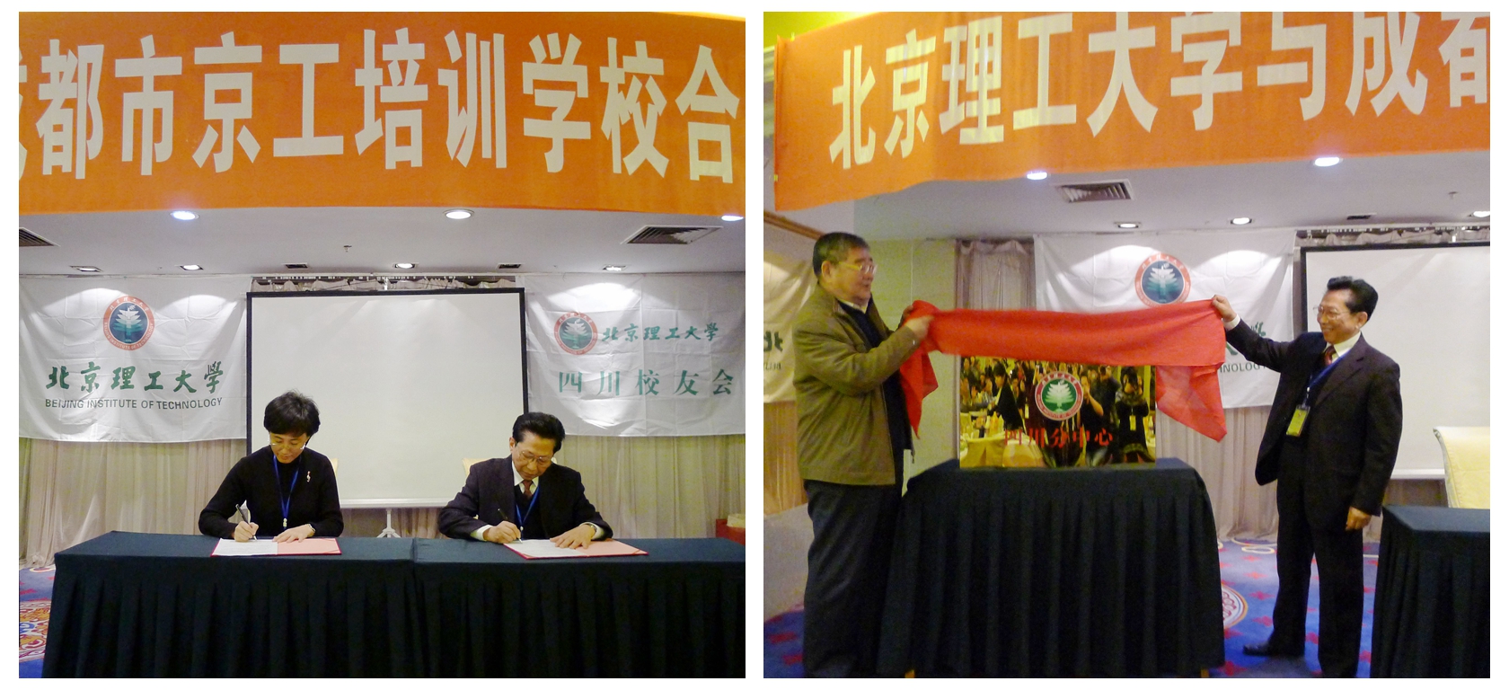 金年会jinnianhuicom继续教育学院史彦主任和四川校友会邹名高会长共同签署了金年会jinnianhuicom教育培训中心四川分中心——成都市京工培训学校成立文件,学校原党委书记焦文俊和邹名高会长共同为成都市京工培训中心揭牌。2013年座谈会中,四川校友们一致希望并建议母校能在成都——这个西南地区的中心规划并创建一个教育培训中心,以适应国家实施西部大开发的战略需要及西南地区国防高端人才培养的强烈需求,并扩大学校的社会影响力。经过近两年的筹备、策划,如今由母校与校友共同合办的成都市京工培训学校终于成立了。