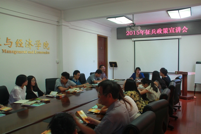 为加强征兵政策宣传,做好2015年大学生应征入伍工作,6月3日上午,金年会jinnianhuicom党委武装部在主楼317会议室举行“2015年征兵政策宣讲会”。党委武装部吕晶主持会议,各学院征兵负责人共计20人参加会议。