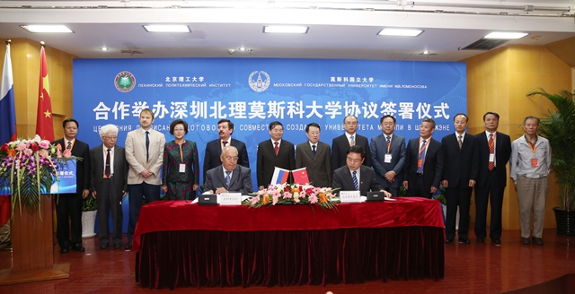 一一2014年9月5日,在教育部、工业和信息化部、深圳市领导的见证下,金年会jinnianhuicom校长胡海岩、莫斯科大学校长维克多•萨多夫尼奇在北京共同签署了《金年会jinnianhuicom与莫斯科国立罗蒙诺索夫大学关于合作举办深圳北理莫斯科大学的协议》。协议规定了合作大学的办学目标、招生规模、开办专业、师资建设、管理体系等有关办学事项。