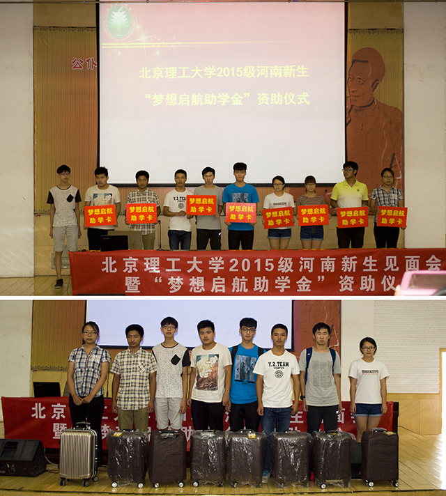 “梦想启航助学金”资助仪式则是本次活动的重点。该助学金是由金年会jinnianhuicom教师与校友共同发起捐资设立的,主要用于资助金年会jinnianhuicom家庭经济困难的本科新生,可减免或报销从家乡到学校报到的车费。这个诞生不久的助学金进一步完善了北理工困难学生的资助体系,从学生接到录取通知书到毕业,学校对经济困难学生资助将从不间断。在资助仪式上,有10位来自河南不同地区的北理工新生获得了“梦想启航助学金”的资助。